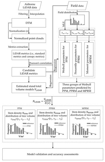 The workflow of this study is presented in Figure 1. The procedures consist of four main steps: Firstly, above-ground returns of raw point clouds data were filtered to obtain ground returns and then interpolated to generate a digital terrain model (DTM) with 1 m resolution. The point clouds were further normalized by the created DTM data. Secondly, the LiDAR metrics (i.e., standard and canopy metrics) were extracted and regressed against field data to estimate total forest volume. The approaches of PPM, PPRM, and MPRM were implemented to estimate the Weibull parameters, percentile parameters and moment parameters of volume distribution respectively. The percentile and moment parameters were then be used for calculating other two groups of Weibull parameters. Thirdly, the stem density within each plot was estimated by means of the LiDAR-estimated plot total volume and mean individual tree volume generated from the estimated Weibull parameters. Finally, the individual tree volume distributions were generated by predicted Weibull parameters and scaling by the field reference and predicted stem density.