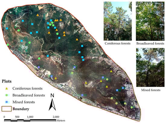 This study was in Yushan National Forest Park, located in Changshu city of Jiangsu Province in southeast China (31°40′29.1″N, 120°42′2.3″E) (Figure 2). It covers approximately 1502.77 hectares of forest, accounting for 96% of the total area. The mountain terrain of this study site has a ridge line of approximately 6500 m that extends towards the southeast orientation, with an elevation in the range of 20–261 m. The climate of this site belongs to north-subtropical monsoon with annual mean temperature, annual mean relative humidity and precipitation of approximately 15.4 °C, 80%, and 1047.7 mm, respectively. Yushan Forest is a secondary forest composed of three main forest types, i.e., coniferous-dominated forests, broadleaved-dominated forests, and mixed forests. The dominant broadleaves include deciduous tree species, e.g., Chinese sweet gum (Liquidambar formosana Hance), Camphorwood (Cinnamomum camphora (L.) Presl.), and Sawtooth oak (Quercus acutissima Carruth.); there are some other evergreen broadleaved tree species, e.g., Chinese holly (Ilex chinensis Sims.), Chinese cork oak (Quercus variabilis), Chinese chestnut (Castanea sequinii), White oak (Quercus fabri Hance) etc. The dominant conifers are Slash pine (Pinus elliottii Engelm.), Chinese fir (Cunninghamia lanceolata (Lamb.) Hook.), and Masson pine (Pinus massoniana Lamb.), mixed with a small number of Loblolly pine (Pinus taeda L.) and Japanese black pine (Pinus thunbergii).