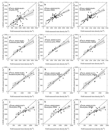 Field-measured stem density versus LiDAR-estimated stem density based on the prediction methods of PPM (left panel), PPRM (middle panel), and MPRM (right panel) in all forest plots (a–c), coniferous forests (d–f), broadleaved forests (g–i), and mixed forests (j–l). Light grey shade represents the 95% confidence interval for predictions. PPM: parameter prediction method; PPRM: percentile-based parameter recovery method; MPRM: moment-based parameter recovery method.