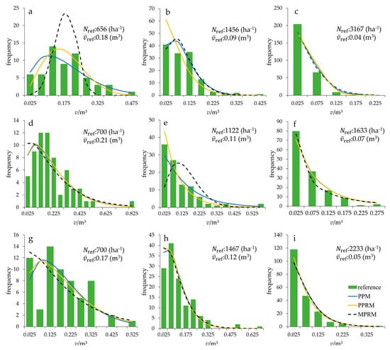 The reference tree volume distribution (green bars) fitted with the Weibull distribution based on the Weibull parameters derived from the PPM, PPRM, and MPRM (using LiDAR-predicted stem density NLiDAR as scaling variables) for nine sample plots of coniferous forests (a–c), broadleaved forests (d–f), and mixed forests (g–i) in low (left panel), medium (median panel) and high (right panel) stem densities. PPM: parameter prediction method; PPRM: percentile-based parameter recovery method; MPRM: moment-based parameter recovery method; Nref: field reference stem density; vref: field mean tree volume.