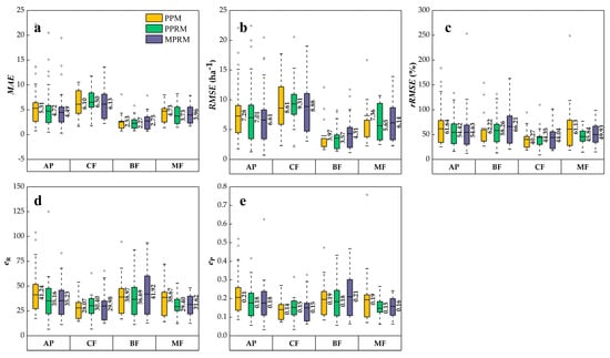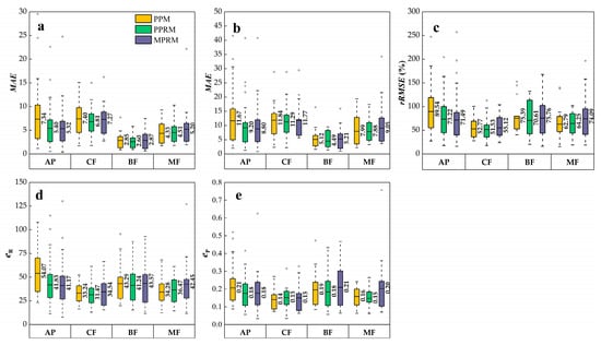 The box plots for the comparison of reference and predicted individual tree volume distributions in different Weibull parameter predictive models (PPM, PPRM, and MPRM) using field reference stem density Nref as the scaling variable. The goodness-of-fit for predicted volume distributions was evaluated by MAE (a), RMSE (b), rRMSE (c), eR (d), eP (e). The number beside each box represents the mean value of the relative statistics. PPM: parameter prediction method; PPRM: percentile-based parameter recovery method; MPRM: moment-based parameter recovery method; AP: all plots; CF: coniferous forest plots; BF: broadleaved forest plots; MF: mixed forest plots.