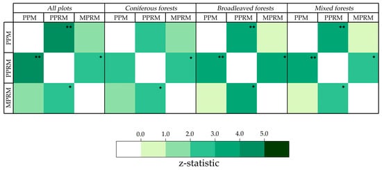 To evaluate the statistically significant differences of the Packalén error index eP for the Weibull parameter prediction methods (PPM, PPRM, and MPRM), the Wilcoxon rank sum test was performed to compare the difference between the eP and other methods (Figure 7). The z statistics results represented deviations between two compared samples, where a higher absolute value suggests a significant deviation. From Figure 7, the results for eP revealed that in the comparisons between the PPRM and PPM for all plots, broadleaved forests and mixed forests were significant at p < 0.01 with relatively high deviations, while the comparisons between the PPRM and MPRM were significant at p < 0.05 level for all forest types. Moreover, the comparisons between the PPM and MPRM were not significant at either p < 0.05 or p < 0.01. The results for eP suggested that the PPRM produced significantly more accurate fitness for all forest types than other methods at p < 0.05.