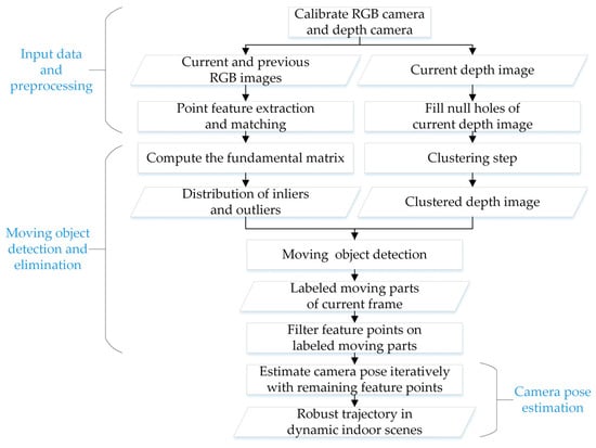 Figure 1 illustrates the proposed RGB-D SLAM in a flowchart, which consists of the following parts: (1) input data and pre-processing; (2) moving object detection and elimination; (3) camera pose estimation. Detailed processes of the algorithms and models are given in the following sub-sections.