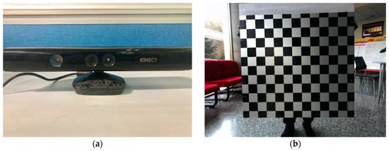 RGB-D camera and flat calibration board used in data acquisition and camera calibration. (a) Microsoft Kinect V1 sensor used in data acquisition; (b) flat calibration board used in camera calibration.