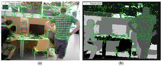 Figure 5a shows the position of feature points on the current RGB images. From Figure 5a, we can see that feature points are spread among moving objects and static environments. We then mapped the positions of these feature points onto the clustered depth map, as Figure 5b shows. We can now count the distribution of feature points in the c-th cluster areas. Note that we have not yet excluded outliers in this step, so we use a statistic of the number and percentage of all feature points, and .