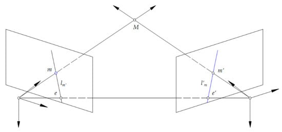 We then used the fundamental matrix constraint [] to identify inconsistency of feature points caused by the motion of the moving objects, and then eliminate the mismatched points. The fundamental matrix describes the relationship between the point and its corresponding epipolar line , which can be expressed as follows:
