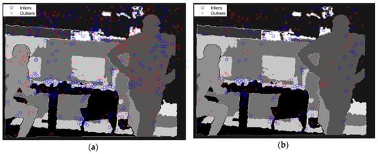 In the third step, we used the fundamental matrix constraint mentioned above to determine the inliers and outliers. We then mapped the positions of these inliers and outliers onto the clustered depth map, as Figure 7a shows. Here, the distribution of inliers in the c-th cluster area can be counted. Note that we excluded outliers in this step, so we employed the number and percentage here as the statistical properties of the first fundamental matrix constraint. In this process, the eliminated outliers contain a small number of mismatching points and some points located in moving parts. As is shown in Figure 7a, the number of outliers removed from moving cluster areas is larger than that in the static environment. This is because feature points on a moving object are more inconsistent than points on a static area. Next, for the remaining inliers, the fundamental matrix constraint was used again to further eliminate the outliers. The positions of the inliers and outliers on the clustered depth map obtained this time are shown in Figure 7b, and the distribution of inliers in the c-th cluster area can be counted. Note that we have excluded outliers again, so we call the number and percentage here the statistical properties of the second fundamental matrix constraint. As is shown in Figure 7, since the number of feature points removed in the moving cluster areas is more than that in the static areas, the proportion of points in the moving areas will decrease.