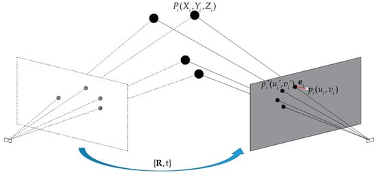 Here, the and represent the orientation and position of the camera, respectively. The matrix , containing camera exterior parameters and , transforms the homogeneous world coordinate system to the current camera coordinate system . represents the interior parameters of the camera, which was obtained from the camera calibration. The homogeneous pixel coordinate is the corresponding re-projected point of . We then used the efficient perspective-n-point method (EPnP) to estimate the camera pose []. Due to the unknown camera pose and noise in the observation, there was a re-projection error between world map points and matched feature points, as Figure 9 shows.