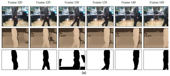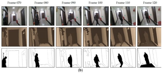Some experimental results of the proposed method using sequence images captured in a corridor environment. (a) RGB-D camera was fixed and the experimenter approached the camera and then turned away from it; (b) RGB-D camera swung from side to side and the experimenter just walked away from the camera plane. The moving objects detected by our method are colored in black, as shown in the third row of each sub-figure.