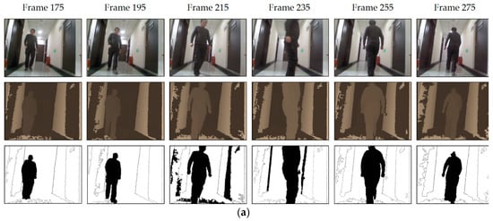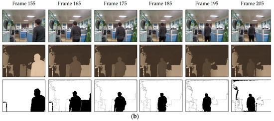 The first scenario is an office environment, where we captured two types of sequence images. Frames selected evenly from the experimental results are shown in Figure 10. In the first sequence images of office, the camera was fixed and the experimenter passed through the view with a direction parallel to the camera plane. The experimenter was about 1.5 m away from the camera and walked at a normal speed. In the second sequence images of office, as shown in Figure 10b, the experimenter walked away from the camera with a direction perpendicular to the camera plane at a normal speed, and the interval of presented images is 10 frames. The three rows from top to bottom are RGB images, depth images, and motion detection results. The black parts in the binary images in the third row are the moving object detected by our method, and the white part is the background. As can be seen from Figure 10, our method can detect and remove the moving objects well in the frames with obvious pedestrian characteristics.