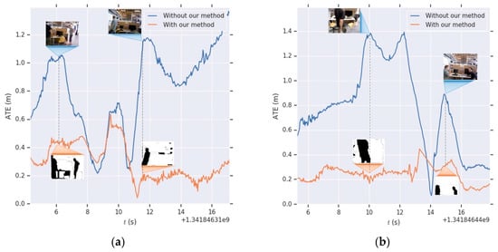 Accuracy of the experiment without moving object detection (blue) and the experiment with our new method (orange) on two highly dynamic datasets. The horizontal axis represents time in seconds, and the longitudinal axis represents the absolute trajectory error (ATE) in meters. (a) 1341846315–1341846327 s part of the fr3/walking_xyz dataset; (b) 1341846446–1341846457 s part of the fr3/walking_halfsphere dataset. The RGB images of blue lines indicate the presence of pedestrians in the FOV of the camera. The black areas in the binary images of orange lines indicate that our improved RGB-D SLAM excluded the influence of pedestrians at these moments when ATE values increased dramatically.