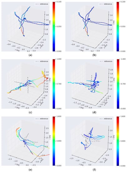 Several accuracy heat maps of the proposed RGB-D SLAM with and without our moving object detection method. The three accuracy heat maps of the left column were estimated without using the moving object detection method on the (a) fr3/sitting_halfsphere, (c) fr3/walking_xyz, and (e) fr3_walking_halfsphere sequences. The three accuracy heat maps of the right column were estimated using the method on the (b) fr3/sitting_halfsphere, (d) fr3/walking_xyz, and (f) fr3_walking_halfsphere sequences. The two color bars of each row have the same maximum error and minimum error. The redder the color is, the larger the ATE is.