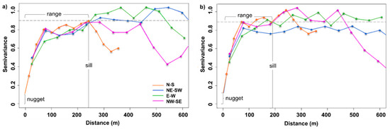 Directional empirical semi-variograms captured on September 18. (a) Semi-variograms for band 13 centered at 549 nm, reached the sill at a range of 240 m. (b) Semi-variograms for band 23 centered at 650 nm, reached the sill at a range of 180 m.