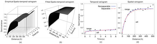 Spatiotemporal variograms for band 45 (862.01nm). (a) 3D empirical variogram. (b) 3D fitted variogram. (c) Fitted separable and non-separable temporal variogram. (d) Fitted separable and non-separable spatial variogram.
