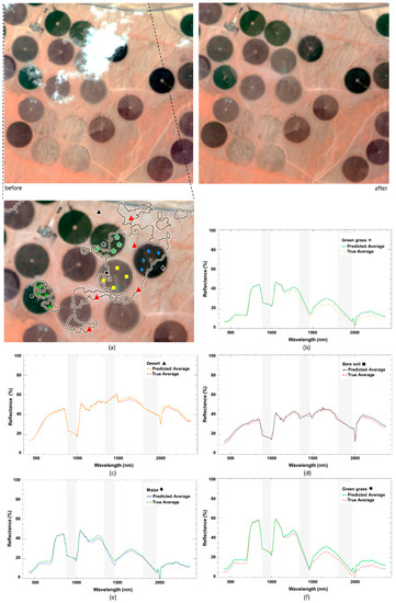 (a) True color composite of the reconstructed image (before and after), together with a comparison between the cloud resolved (predicted average) and cloud-free (true average) spectral profile for different land covers, including (b) green grass, (c) desert, (d) bare soil, (e) maize, and (f) green grass. Gray bars indicate non-observed wavelength ranges.