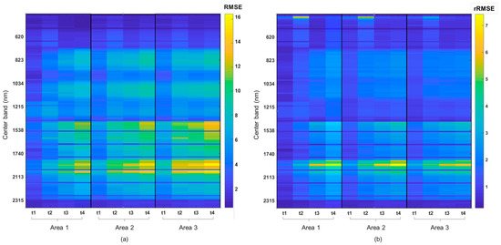 Evaluation results of the gap-filling spatiotemporal model showing: (a) color-scale image of the RMSE (% of absolute reflectance units) for each one of the 166 bands (rows) per prediction time (columns) and arranged in ascending order from left to right according to the sampled area. (b) Color-scale image of the corresponding rRMSE achieved (% units).