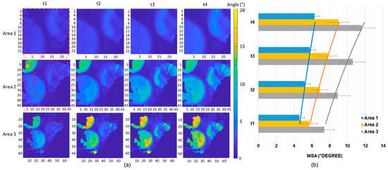 Evaluation of the spectral accuracy of the gap-filling spatiotemporal model, showing (a) spectral angle difference per retrieved time per each sampled area, and (b) MSA metric per retrieved time per each sampled area.
