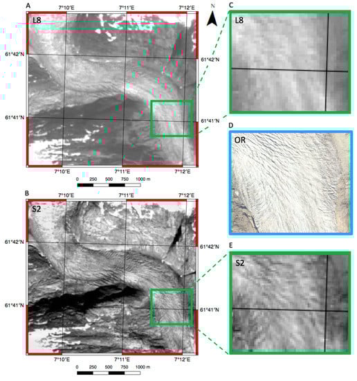 Comparison of Landsat 8 (L8) with Sentinel-2 (S2) and ortophoto (OR) of Nigardsbreen tongue and terminus using imagery acquired on 22.08.2017 (S2 and L8) and on 26.08.2017 (OR). (A) L8 band 8 image of 15 m ground resolution over the area of interest; (B) S2 band 8 image of 10 m ground resolution over the area of interest; (C) Close-up of the image A displaying minimal signs of crevassing; (D) Close-up of ortophoto displaying heavy crevassing in the upstream and lateral sections at 0.25 m ground resolution; (E) Close-up of the image B displaying clear crevassing in the upstream and lateral parts.