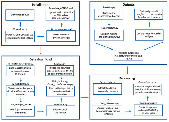 The SenDiT structure can be separated into four stages: installation, data download, data processing and visualization (Figure 2). Installation involves downloading the toolbox and installing individual components in line with the provided instructions. Data download involves creating a text file specific to each study, and initiating the download of all imagery adhering to the criteria specified in the input text file. Processing involves establishing the pairs, performing feature tracking, and calculating displacement magnitude and displacement direction of all the pairs that adhere to the conditions set in the download section. Output presentation involves the rasterizing and storing of the results in a format so that they can be visualized in a GIS software. The requirements and installation instructions are provided in detail as a part of the ‘00_readme.txt’ file. The toolbox was created using Python 3.6 due to its free world-wide availability and no license burden. Running of the toolbox requires that the Python 3.6 console is installed and the IMCORR feature tracking software compiled individually [8]. The building block of the system is the Sentinelhub package developed by the European Space Agency (ESA), allowing users to make web requests to download and process satellite images within Python 3.6 scripts, supporting amongst other sources the Sentinel-2 imagery.