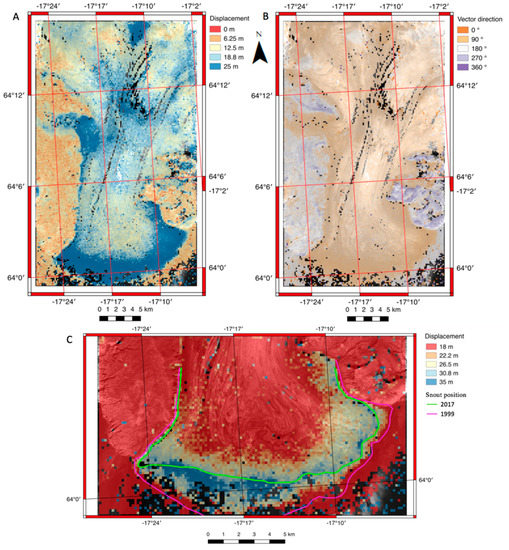 (A) Displacement map of pair 20.08.2017–22.08.2017 over Skeiðarárjökull displaying increased magnitude of displacement at the terminus and lateral regions; (B) Flow direction map of pair 20.08.2017–22.08.2017 over Skeiðarárjökull displaying dominant eastward direction of displacement field over the glacier; (C) Close-up displacement map of the terminus of Skeiðarárjökull and position of the snout on 22.08.2017 and 06.08.1999. Pixels with no displacement data are left blank.