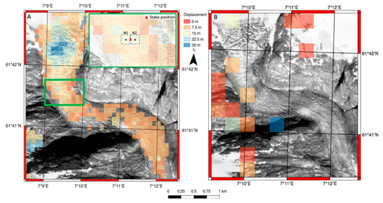 (A) SenDiT derived displacement map of pair 27.08.2017–16.09.2017 over Nigardsbreen outlet glacier with a close-up image of a position of the stake and points N1 and N2 over orthophoto from 26.08.2017 with 0,25 m ground resolution; (B) GoLIVE service displacement map of pair 22.08.2017–23.09.2017 over Nigardsbreen outlet.