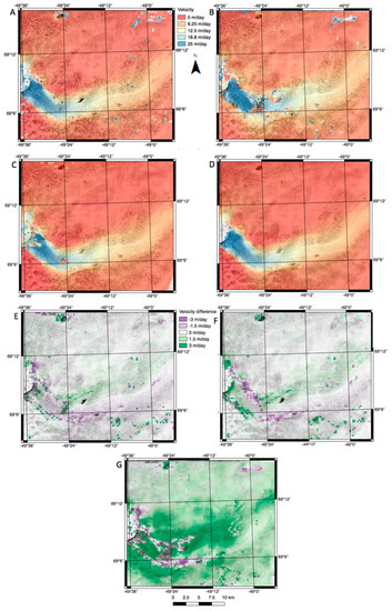 Velocity maps of Jakobshaven Isbræ for: (A) pair J3: 18.07.2017–28.07.2018 using SenDiT; (B) pair J4: 18.07.2017–03.08.2017 using SenDiT; (C) pair J5: 18.07.2017–03.08.2017 using GoLIVE; (D) pair J6: 01.07.2017–31.07.2017 using MEaSURE. Velocity difference maps for: (E) pairs J3 and J5; (F) pairs J3 and J6; (G) pairs J4 and J5.