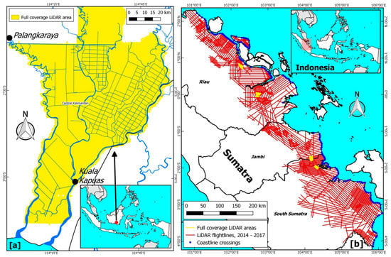LiDAR coverage over the Indonesian Provinces (a) Central Kalimantan and (b) Riau, Jambi, and South Sumatra. Areas of full LiDAR coverage are indicated in yellow, and partial LiDAR coverage is indicated in red. Locations of LiDAR flight coastline crossings used in validation of MSL are indicated with blue dots along the East Sumatra coast (Section 3.3).
