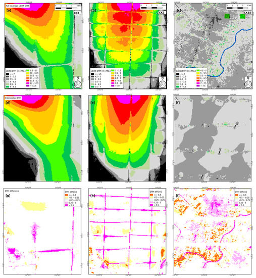 (a–c) Full coverage LiDAR DTM, and (d–f) interpolated DTM from simulated 5 km flight line intervals plus main rivers and contour lines, and (g–i) the difference between interpolated and full coverage LiDAR DTM, for (from left to right) areas CK2, CK3, and CK15 (see also Figure 3). Note that for the DTMs of the three different areas the same legend color scheme was used but with different elevation intervals.
