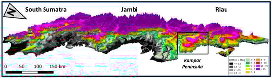 The DTM coverage of 7.1 Mha in the East Sumatra provinces of Riau, Jambi, and South Sumatra (Figure 7) constitutes 80.4% of the lowland area in these provinces, and 63.6% of the lowland area in Sumatra as a whole (11.2 Mha), as determined from the lowland boundary determined by [28]. The DTM covers 4.5 Mha of peatland according to the peat map published by the Indonesian Ministry of Agriculture in 2011 [27], which is 62.7% of the total Sumatra peatland coverage of 6.6 Mha according to the same source.