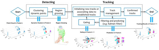 To detect an object from point clouds, we can use either model-based approaches or model-free methods [9]. Model-based approaches detect objects based on prior model information. Such approaches are preferred when the interest targets are specified and therefore can be modeled in advance [9,10,11]. Model-free approaches don’t require prior model information so that objects of arbitrary shapes and sizes can be detected. For example, [12] project all 3D points onto 2D occupancy grids parallel to the ground and clusters all connected cells into one large cell; the clustered objects are then classified as human or non-human by a trained support vector machine. [13] propose a simultaneous detection and tracking method without specifically detecting the objects in each frame. [14] uses a cluster detector to detect moving objects in LiDAR scans and tracks them with an unscented Kalman filter and nearest neighbor data association methods. [15] construct a system using a variant of Random Sample Consensus (RANSAC) that estimates the vehicle pose and detects moving objects via distinguishing non-stationary objects from stationary ones by the spatial consistency and differentiating moving objects from outlying objects by temporal consistency. [16] detect static points by traversing a voxel grid and finding differences in volumetric occupancy with “point shadows”. In addition, some methods use point cloud descriptors to assist detection and object-to-track association. In the work of [9], uniformly sampled key points in consecutive scans are matched by their Signature of Histograms of OrienTations or SHOT [17]. [18] organize local convexity criterion with the normal vector and flatness value for each point, which are used to detect moving objects and manage tracks. [19] obtain high-order feature representations for 3D local patches by deep learning techniques; then automatically detect 3D vehicles using Deep Boltzmann Machine Hough Forests.