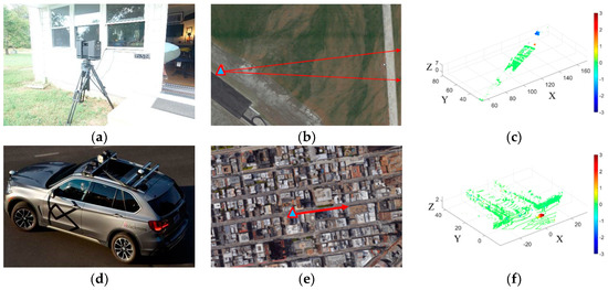 Figure 2. The scanners and study areas. The static terrestrial (a) and the mobile (d) Doppler LiDAR systems, the test site ((b,e): blue triangle: scanner; red arrow: beam direction), and one frame point cloud color coded by speed ((c,f): unit: m/s).