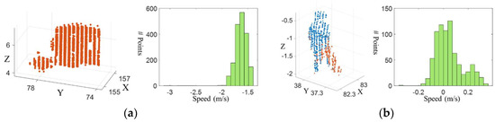 Figure 3. Moving objects and their speed histograms. It shows the point cloud of a segmented truck (a) and a segmented pedestrian (b) and the corresponding speed histograms (x-axis: speed at 0.1   m / s bin); y-axis: number of points). In this illustration, moving points are colored in red while static points blue.