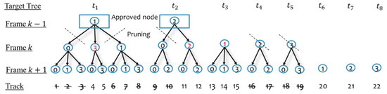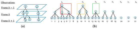 Figure 5. Gating and association principles. (a) Observations in three consecutive frames. There are two observations in frame k 1 and three object observations in frame k and k + 1 . The arrows indicate the potential object-to-track associations. (b) Initialized and updated target trees.