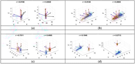 Figure 7. Calculated correlation coefficients ( r ) between OESF feature vectors of objects in the KITTI dataset (left) and Doppler LiDAR dataset (right): (a) the same pedestrian in neighboring frames; (b) the same vehicle in neighboring frames; (c) different pedestrians; (d) a pedestrian and a vehicle.