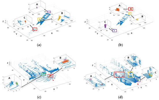 To detect the moving part of a moving object, we first use a speed threshold ϵ v to distinguish static points and moving points. Because the precision of the radial speed measurement is ± 0.1   m / s , we set ϵ v as 0.1, namely, points whose radial speed magnitude larger than 0.1   m / s are detected as moving points, while the rest points are static.
