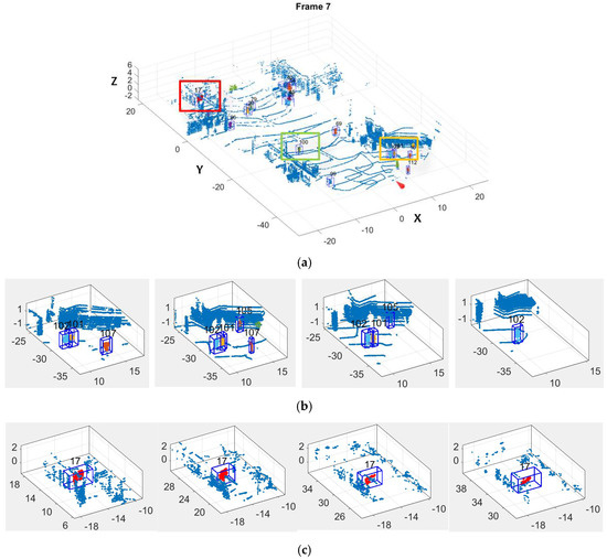 Figure 10. (a) Tracking results of frame seven in sequence C; (b) Tracks #101, #105, #107 in frames two, 10, 11 and 14 (Track #107 leaves the scene, so do Track #101 and Track #105 in frame 14); (c) Track #17 in frames 7, 49, 67 and 79.