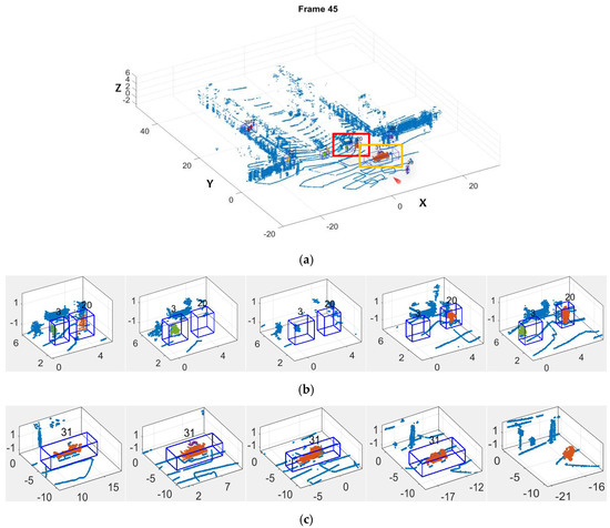 Figure 11. (a) Tracking results of frame 45 in sequence C; (b) Tracks #3 and #20 of pedestrians in frames 45 to 49 (Due to occlusion, the pedestrian in Track #3 isn’t scanned in frame 47 and 48, and the pedestrian in Track #3 isn’t scanned in frames 46 and 47. However, both tracks are kept and recovered when missing objects appear again); (c) Track #31 of a car in frames 41, 45, 49, 56, 57. Half of the car has left the scene in frame 57.