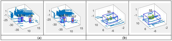 M i n P t s is set to smooth the density estimate, which is empirically set as 40 in this study. ϵ T is set as 0.02s. The distance threshold ϵ ( r i ) decides the range of density reachability [26]. The distance between two neighboring points (point density) is associated with the azimuth sampling resolution r θ and the distance from the point to the sensor r i . To distinguish different objects reliably, the distance between two objects should be at least twice lager than the arc length between neighboring beams. Considering the potential non-reflection beams, we set a slightly loose threshold ϵ ( r i )   = 3 r i r θ .