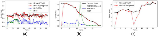 Figure 13. (a) Speed comparison of a pedestrian; (b) speed comparison of a slow-down vehicle; (c) speed comparison of the passing vehicle in Track #31.