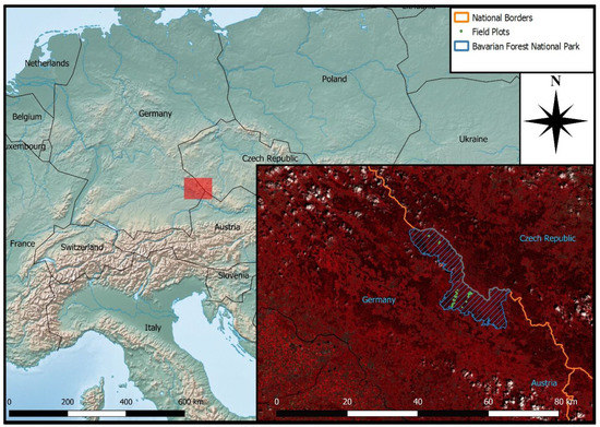 The Bavarian Forest National Park lies at the Czech–German border. The satellite picture (inset at the red rectangle) is a false-color composite of the NIR, red, and green bands of the Landsat-8 scene.