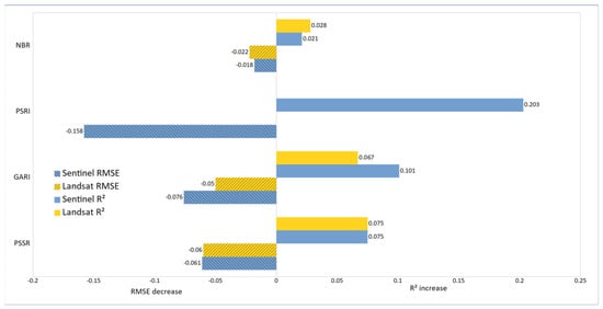 Combining the best performing vegetation indices from each index group into multiple linear regression models also did not result in better fits than the simple linear models (see Section 4.2). The Landsat-8 indices used as predictors in multiple linear regression models were: pigment-specific simple ratio (PSSR), green atmospherically resistant vegetation index (GARI), and normalized burn ratio (NBR). The same variables were selected as predictors in the Seninel-2 model as well as the RE index PSRI. For both, Landsat-8 and Sentinel-2, stepwise selection yielded a single-variable model based on the GARI. Hence, the model statistics were almost identical with Sentinel-2 (R2 = 0.450; RMSE = 0.887) and Landsat-8 (R2 = 0.445; RMSE = 0.884).