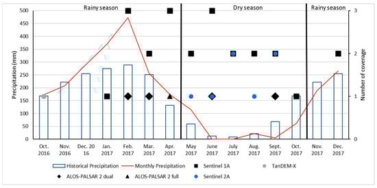 . Historical (1961–2017) and Monthly (2016–2017) precipitation values and acquisition dates of Sentinel 2A, ALOS PALSAR 2 full, ALOS PALSAR 2 dual, TanDEM-X and Sentinel 1A. Precipitation data were collected from the Diamatino fluviometric station located near to the study area.