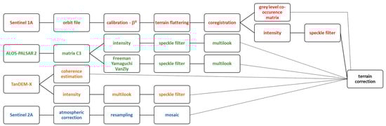 In the second part, we processed the intensity images. We performed multilook in both images (coherence and intensity) from the first and second part, with 4 looks in azimuth and 3 in range to reduce the noise. Additionally, we applied, as with the other images before, the speckle filter Refined Lee (window 5 × 5). For the last step, we applied the Range Doppler terrain correction. All images were processed to have a final product with spatial resolution of 10 m. The PCA was not applied for TanDEM-X due to the use of only one single date.