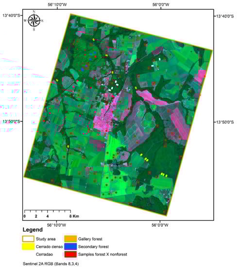 Forest-type mapping was only conducted in the areas masked as forests in the previous step. We created 24 reference areas equally distributed into four different vegetation classes (cerradão, cerrado denso, gallery, and secondary forest). Each one had an area of 14.265 ha (Figure 5). The polygons were classified based on field data collection (July 2017) and high-resolution imagery from Google Earth and Sentinel 2A (26 July 2017). During the classification process using RF, we used 70% of the pixels in the 24 references areas for training and 30% for validation.