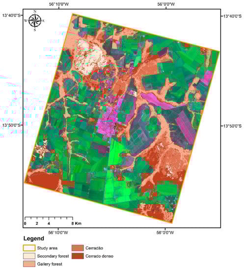 In our study, we mapped the four dominating vegetation types in Nova Mutum, cerradão (Open Forest), cerrado denso (Dense Woodland), gallery forest, and secondary forest. Cerradão and cerrado denso are located within the transition area of the Amazon and Cerrado biomes. As mentioned before, this area has a high deforestation rate, which can explain the presence of secondary forest. Cerradão has a crown cover between 50 and 90% and the height of the trees varies from 8 to 15 m. In general, the soils of Cerradão are well drained, deep, and have medium–low fertility. Cerrado denso has a crown cover between 5 to 70% and tree height varies from 5 to 8 m. The layers of shrubs and herbs are less dense compared to cerradão. In general, the soils of cerrado denso have medium to very clayey texture and are middle-well drained. The gallery forest has a crown cover between 70 to 95% and the height of the trees varies from 20 to 30 m. Secondary forests are formed after clear-cutting and have different structures, depending on the age of the succession. At the beginning of its succession time, these secondary forests are poor in biodiversity and have a simple structure, whereas in the next succession time, its structure depends on environmental factors such as soil, climate, and management [].