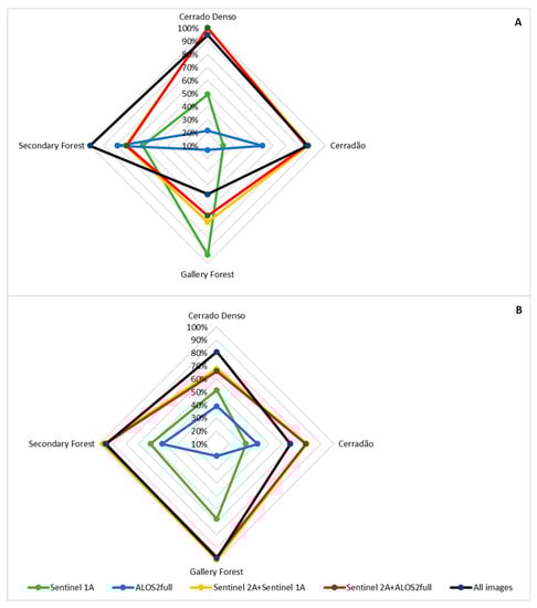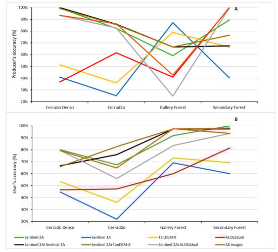 The highest producer’s accuracy for the cerrado denso class was achieved with S2 and ALOS-PALSAR 2 full polarimetric classification, and the highest user’s accuracy was achieved with the classification that used all images. The highest producer’s and user’s accuracy for cerradão class was reached with the classification that used S2 and S1. For the gallery and secondary forest, the highest user’s accuracy was obtained using S2 and S1 images. The highest producer’s accuracy for the gallery forest was achieved with S1 images and for the secondary forest class with all images (Figure 10).