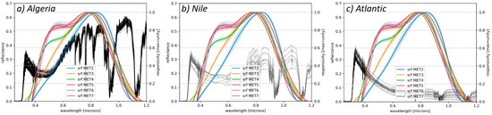 Spectral Response functions of Meteosat-2-7 plotted together with SCanning Imaging Absorption spectroMeter for Atmospheric CartograpHY (SCIAMACHY) spectra acquired during 2002 at three target sites. (a) shows the spectra measured by SCIAMACHY at the Algeria site, (b) shows the spectra measured at the Nile-delta and the (c) shows those measured at the Atlantic-1 site. Spectra are plotted at in transparent black to better illustrate their spread. Spectra with strong cloud contamination were removed before plotting (see Section 3.9.1). Note that for band-adjustment/homogenisation more sophisticated filtering regarding clouds and scene heterogeneity is applied (Section 3.9.1).