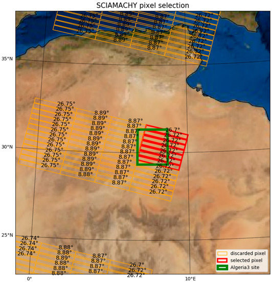 Scan pattern of one SCIAMACHY overpass over Algeria-3 with 4 pixel per scanline. The numbers provide the viewing zenith angle at the center of each pixel. The green box is the 2° × 2° box of the target site. The red pixel are considered for the computation of the spectral band adjustment factor for the homogenisation of the timeseries at this target. The orange pixel are disregarded.
