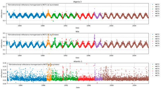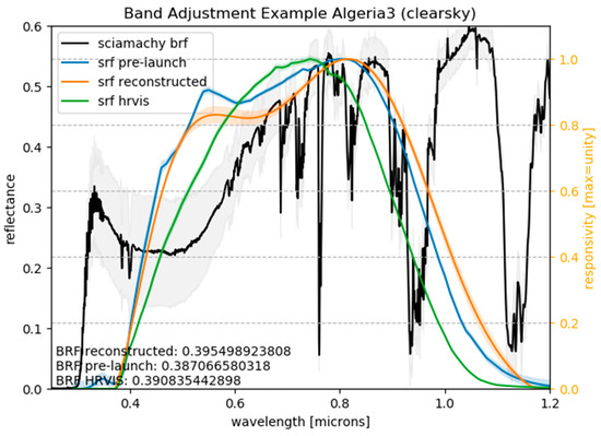 As per definition of a harmonised FCDR [23], the differences in the characteristics of the involved instruments introduce jumps that remain visible even after thorough recalibration. Those jumps are caused by the different shape of the SRF of each MVIRI model. As such, they are not remainders of an incomplete recalibration process, but rather reflect the fact that the measurements are indeed different. Depending on the target in the field of view and its spectral BRDF, the jumps can be larger or smaller, positive or negative. An illustration of the SRFs together with SCIAMACHY spectra from three typical target sites is provided in Figure 2.