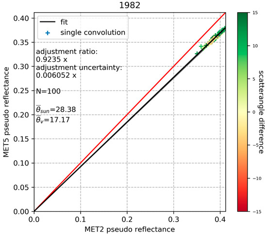 For the computation of the spectral band adjustment factors each individual SCIAMACHY spectrum is convoluted with the SRFs of the reference and the monitored sensors to obtain pseudo reflectances from these two sensors. The spectral band adjustment factors are obtained from the linear regression coefficients of the fit between the pseudo reflectances from the reference and the monitored sensor. Since the SRFs of the monitored sensors used in the MVIRI visible channel FCDR from FIDUCEO vary with time, spectral band adjustment factors needed to be calculated each time the SRF of the monitored instrument changed. An example for the adjustment of Meteosat-2 in 1982 to Meteosat-5 at launch is given in Figure 5. In order to assess the stability of the MVIRI VIS FCDR, the 1982–2006 time-series of the Zero Degree Mission (ZDM) over the validation sites (Table 4) are band adjusted to Meteosat-5 as a reference sensor.